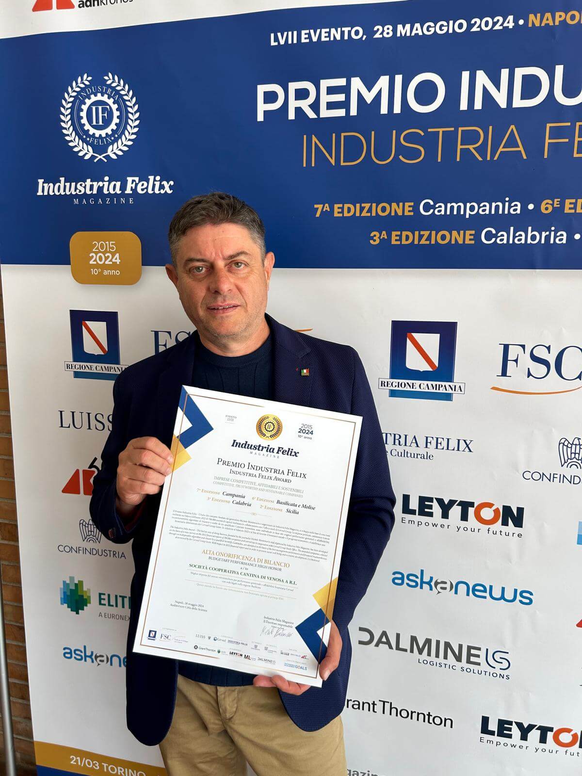 È stata selezionata fra 700mila società di capitali “residenti” in Italia e valutata per una serie molto positiva di criteri finanziari e di sostenibilità. Il conferimento al Presidente Francesco Perillo, alla presenza del governatore della Campania, Vincenzo De Luca. L’iniziativa è promossa dal Centro Studi Industria Felix srl, società editrice del periodico di economia e finanza “Industria Felix Magazine – L’Italia che compete”, supplemento de Il Sole 24 Ore