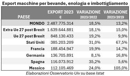 FIERE, SIMEI: VOLA L’EXPORT MADE IN ITALY DI MACCHINE PER BEVANDE, ENOLOGIA E IMBOTTIGLIAMENTO. BOOM DALL’EXTRA-UE NEL 2023 (+18% SUL 2022)