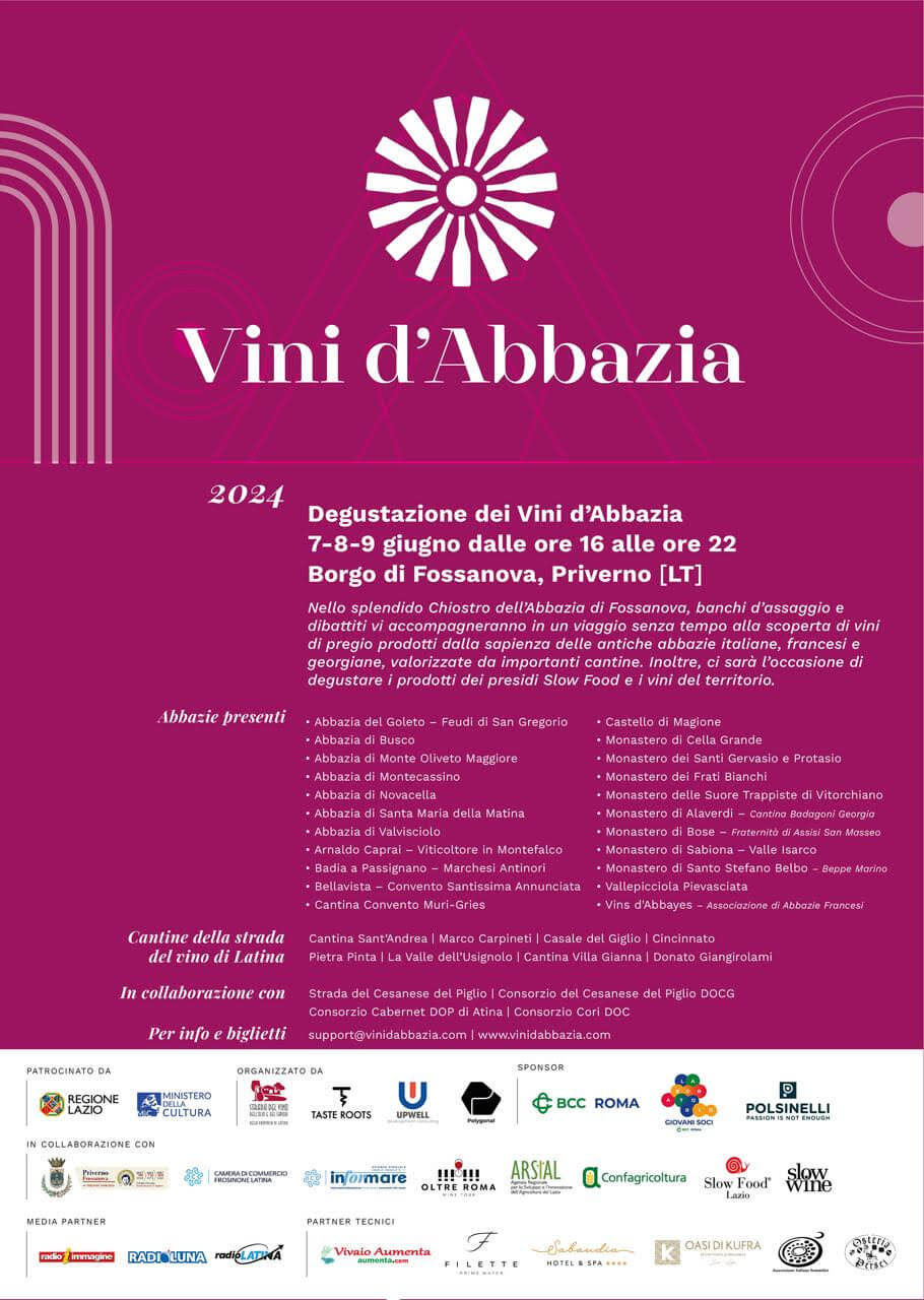 Dopo il grande successo delle due edizioni precedenti l’Abbazia di Fossanova ospiterà, dal 7 al 9 giugno 2024, oltre 30 cantine tra cui alcune importanti Abbazie francesi legate all’Associazione Les Vins D’Abbayes, che svolge un’analoga manifestazione a Parigi.