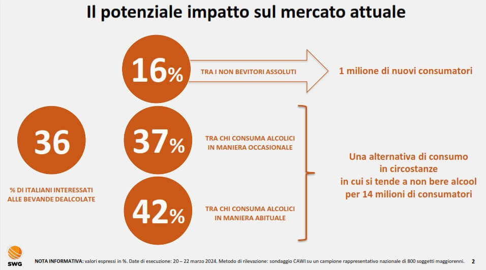Al tavolo, assieme alle testimonianze di 7 imprese (Argea, Doppio Passo, Hofstatter, Mionetto, Schenk, Varvaglione, Zonin) costrette a dealcolare all’estero, anche gli analisti di Swg e dell’Osservatorio del vino Uiv-Vinitaly, per fare il punto su un segmento ritenuto complementare – anche nel Belpaese – ai consumi di vino tradizionale. Lo testimonia l’indagine realizzata da Swg su un campione rappresentativo di italiani; “Questi prodotti – ha detto l’analista Swg, Riccardo Grassi – interessano prima di tutto un potenziale di 1 milione di non bevitori di alcolici, oltre a una platea di consumatori di vino o altre bevande (14 milioni) che li ritiene una alternativa di consumo in situazioni specifiche, come mettersi alla guida”. Una tipologia che potrebbe essere un nuovo alleato anche per il vigneto Italia: “Sentiamo sempre più spesso parlare di espianti finanziati – ha aggiunto Castelletti – ma le imprese, che negli ultimi anni hanno ristrutturato metà del proprio vigneto (310 mila ettari) con erogazioni pubbliche pari a 2,6 miliardi di euro, vogliono continuare a svolgere il proprio lavoro, magari riducendo le rese, puntando ancora di più sulla qualità e – perché no – potendo contare su un nuovo asset di mercato come quello dei Nolo che interesserebbe aree produttive più in difficoltà”. Secondo Swg, la quota di attenzione verso i vini dealcolati (21%) è più alta nelle fasce più giovani (28% da 18 a 34 anni), il target a maggior contrazione dei consumi di vino che nel 79% dei casi dichiara “importante” se non “molto importante” o “fondamentale” poter ridurre i problemi legati all’abuso di alcol mettendo a disposizione dei consumatori prodotti a zero o bassa gradazione.
