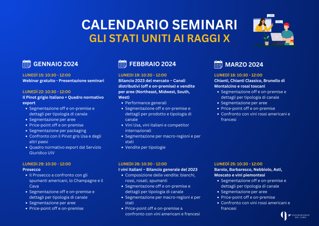 (Roma, 15 gennaio 2024). Novembre nero per le vendite di vino negli Stati Uniti. Il totale dei consumi enologici statunitensi segna un calo tendenziale mensile dell’11%, dato che porta il gap di vendite a volume nei primi 11 mesi 2023 a -8%. Va meglio per i soli vini italiani, che tra off trade e horeca a stelle e strisce limitano le perdite a -3% in novembre e a -3,5% nel cumulato dell’anno. Lo rileva l’Osservatorio del vino di Unione italiana vini (Uiv) in occasione del suo primo webinar dedicato al mercato Usa in presenza di circa 160 iscritti in rappresentanza di imprese e consorzi del vino.
